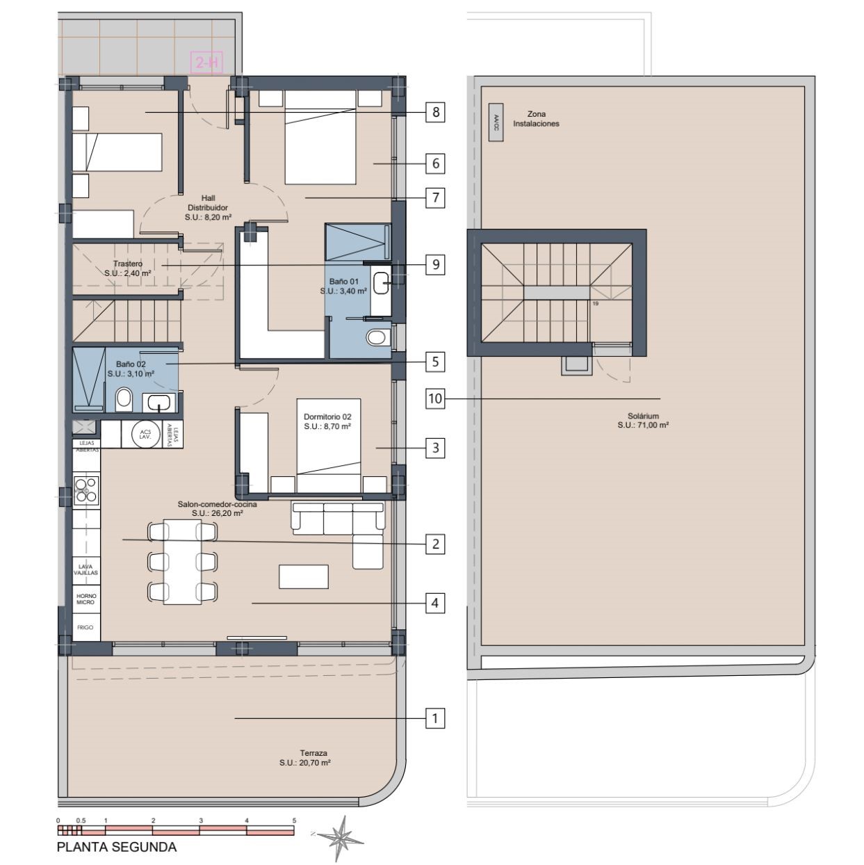 Deze woning is gelegen op de bovenste verdieping, waardoor deze geniet van heel wat buitenruimte. Er is een ruim terras voorzien van 20m², aansluitend aan de woonkamer. Via een binnentrap in het appartement, kom je terecht op jouw privésolarium van maar liefst 71m². Hier kan je de hele dag door genieten van de zon en de meest prachtige zichten.