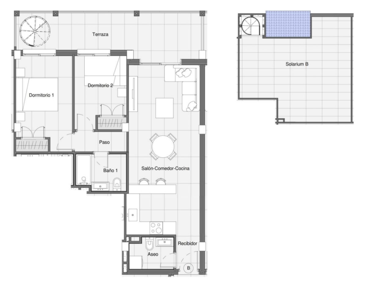 Deze woning is voorzien van een ruim terras van 20m². Dat terras loopt over beide slaapkamers én de woonkamer. Zo heeft elke kwalitatieve leefruimte toegang tot het terras én worden deze ruimtes voorzien van voldoende natuurlijk lichtinval. Via een buitentrap bereik je de bovenste verdieping, waar er een solarium gelegen is van 51m².