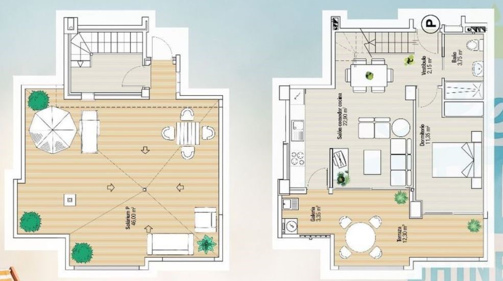 Dit penthouse wordt type P genoemd, en is gelegen op de bovenste verdieping. De woning is verdeeld over 2 verdiepingen en is voorzien van 1 slaapkamer met 1 badkamer.