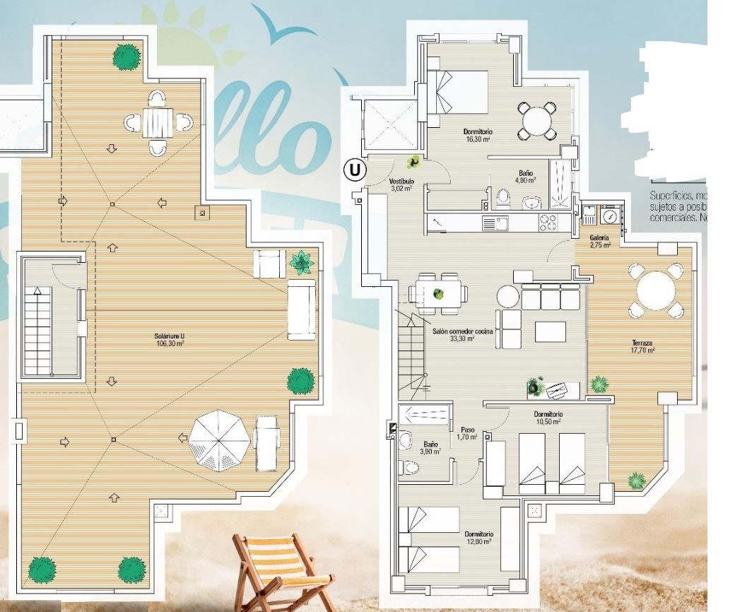 Dit moderne penthouse, type U, is gelegen op de bovenste verdieping van een exclusieve residentie in La Manga del Mar Menor. De woning beschikt over drie slaapkamers en twee badkamers, een ruime leefruimte met open keuken en grote kamerhoge ramen die zorgen voor overvloedig licht en een adembenemend uitzicht op zee.