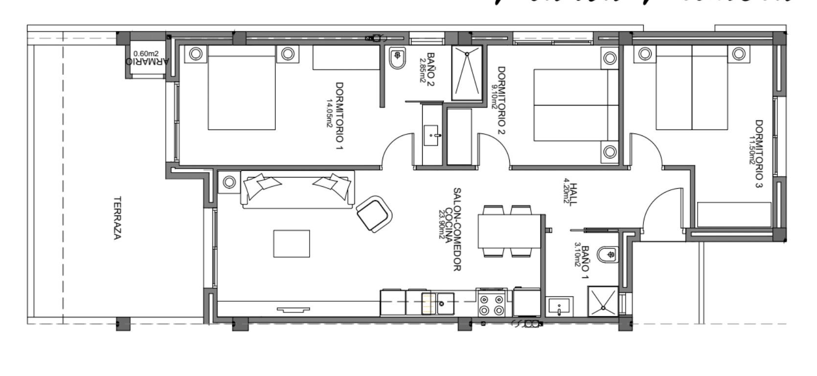 De leefruimte met keuken (24 m²) geeft toegang tot het balkon, dat uitkijkt op de gemeenschappelijke zones. De buitenruimte biedt een oppervlakte van 20m², inclusief een handige berging met aerothermische boiler.