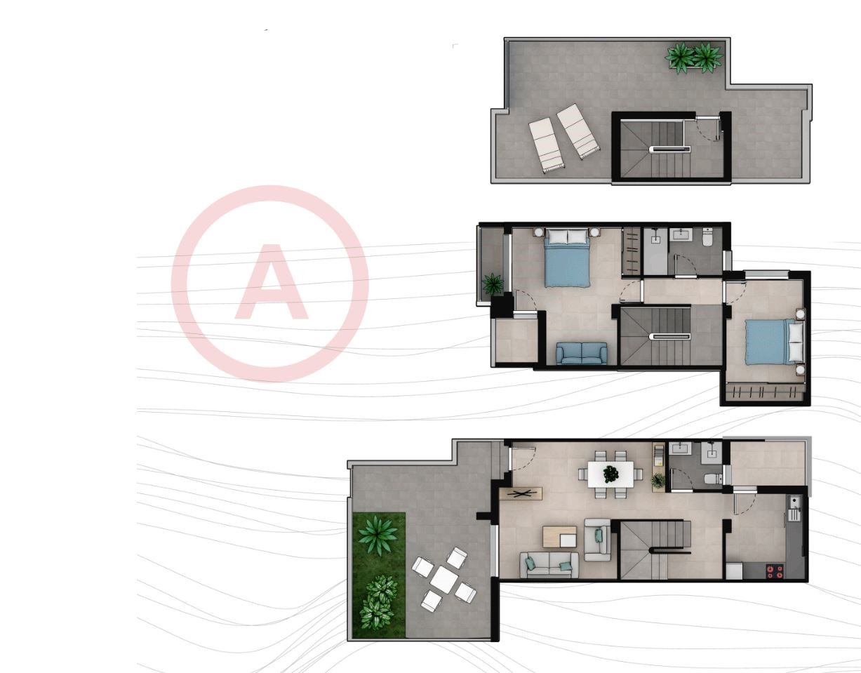 Deze geschakelde woning is gelegen op maar liefst 100 meter van het strand, van de Mar Menor. Deze woning is voorzien van 2 slaapkamers met 2 badkamers en verdeeld over 3 verdiepingen. Allereerst is ter hoogte van de woning een oprit gelegen, waar je in de ondergrondse parking terecht komt. Er is telkens 1 parkeerplaats voorzien voor elke woning.