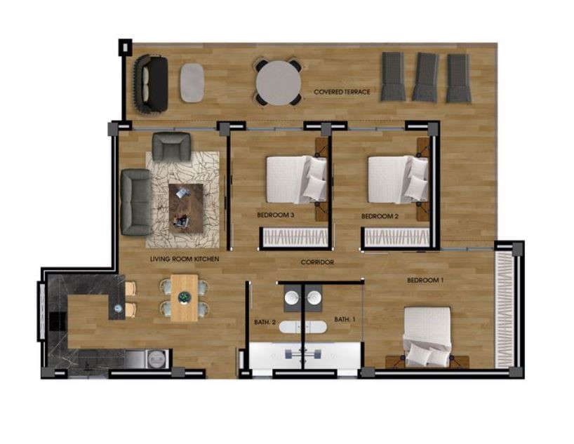 Er is een ruime leefruimte met open U-vormige keuken. De keuken wordt geleverd zonder elektrische apparaten. Doorheen de woning staat kwaliteit maar ook lichtinval centraal. Dit is wat Velapi Golf zo uniek maakt, de doordachte en strategische ligging van de appartementen. Vanuit elke woning heb je prachtig zicht op de golfbaan, waar je urenlang naar kan staren.