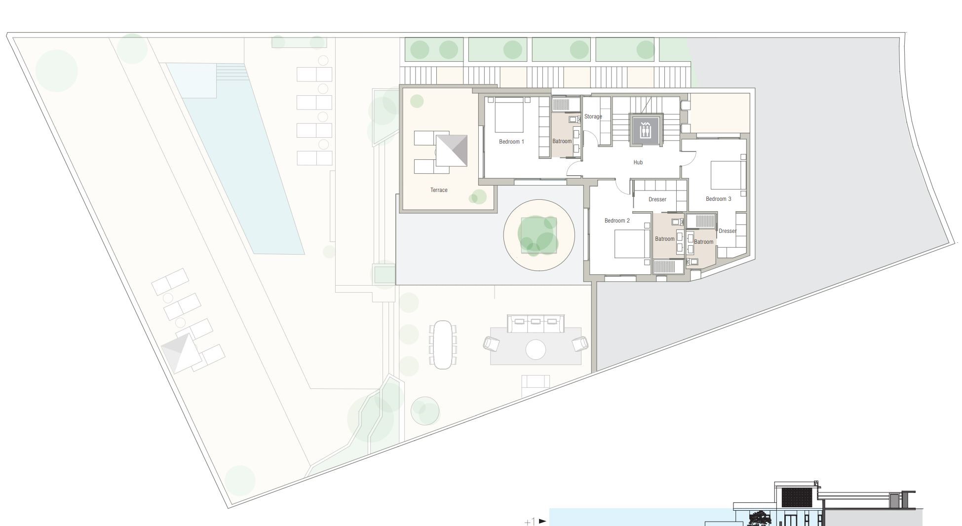 Op de eerste verdieping bevinden zich drie extra slaapkamers, elk met een eigen badkamer en ruime inbouwkasten of dressing. Eén slaapkamer heeft een privéterras met zicht op de tuin. Extra opbergruimtes met inbouwkasten zorgen voor maximale functionaliteit. Buiten biedt de villa een perfect aangelegde tuin met verschillende terrassen, bioklimatologische pergola, buitenkeuken/bbq-zone en een privézwembad met buitendouche.