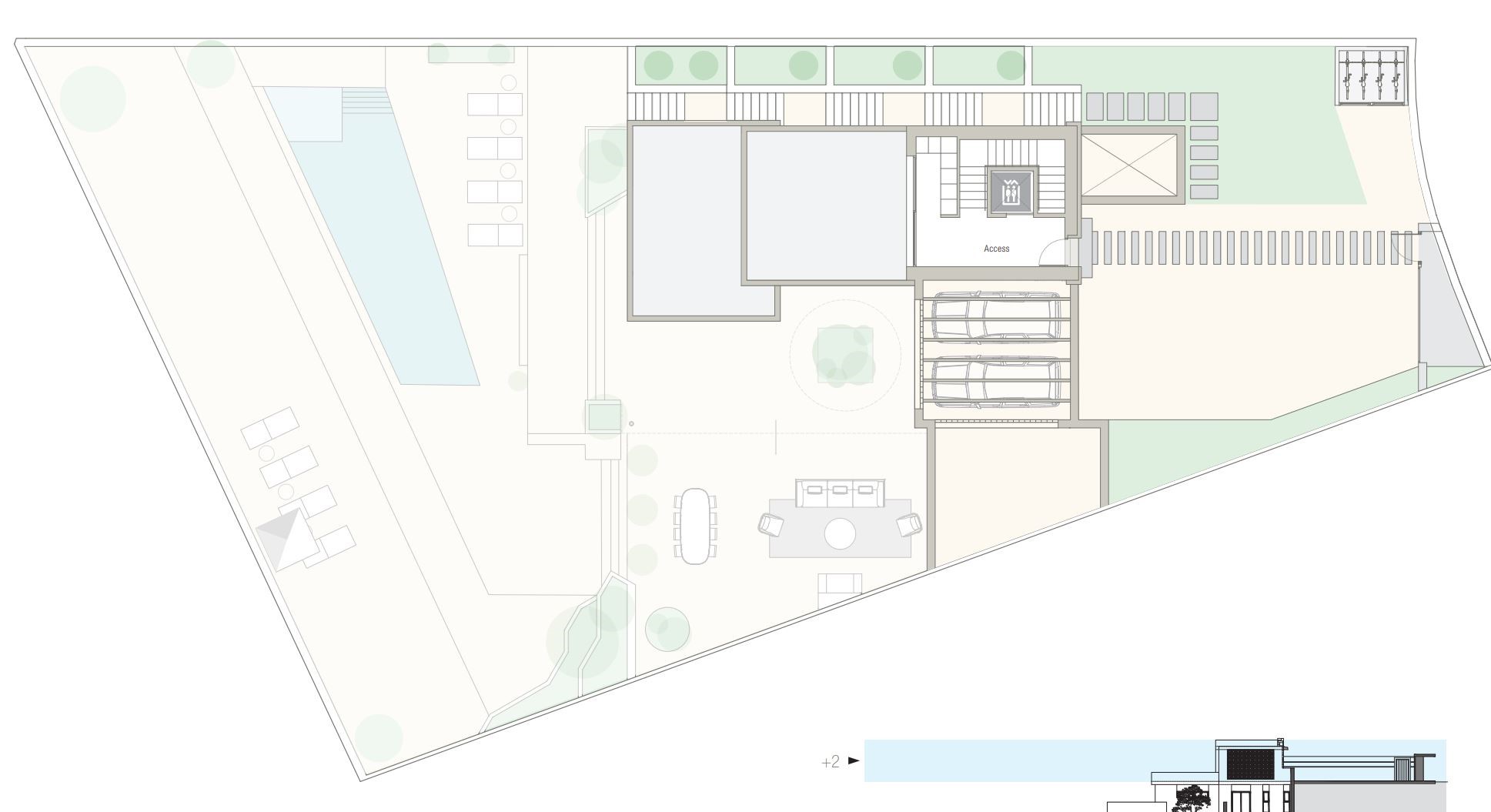 Rondom de woning zijn er aangelegde terrassen voorzien én een bioklimatologische pergola. Zo kan je volop genieten van de zon maar zal de zon niet in overlast in jouw leefruimtes binnen schijnen. Er is ook een privézwembad voorzien met buitendouche. Rondom het zwembad is er met een anti-slip ligweide gelegd, zodat je volop kan ontspannen.