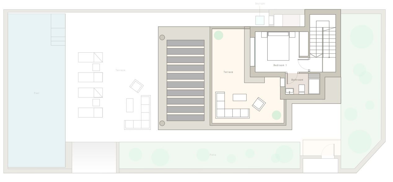 In de onderbouw zijn er 3 slaapkamers gelegen en 2 badkamers. De hoofdslaapkamer heeft een badkamer-ensuite en een ruime dressing. De andere slaapkamers zijn voorzien van inbouwkasten met hangrekken, legplanken en lades. Elke slaapkamer heeft toegang tot de groene patio, zodat je wakker wordt met heel wat natuurlijk licht.