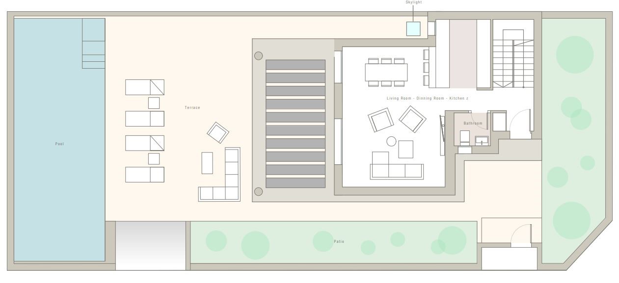 Op de gelijkvloerse verdieping bevindt zich een royale leefruimte met open keuken, voorzien van kookeiland en alle elektrische toestellen: vaatwasser, oven, magnetron, keramische kookplaat, koelkast en diepvriezer. Grote schuiframen zorgen voor overvloedig licht en directe toegang tot de tuin met zwembad van 12 x 3 meter, afgewerkt met mozaïektegels en inheemse beplanting.