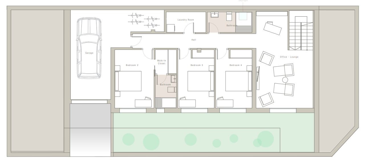 De onderbouw van 150m² uitzonderlijk veel ruimte biedt, met garage, wasruimte en meerdere slaapkamers die uitkijken op een groene patio.