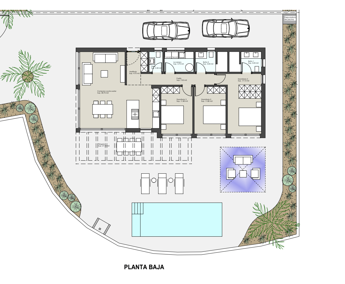 Technische kenmerken: LED-verlichting, porseleinen vloeren, dubbele beglazing, aerothermisch warmwatersysteem, pré-installatie airconditioning, beveiligingssysteem met camera’s en automatisch irrigatiesysteem