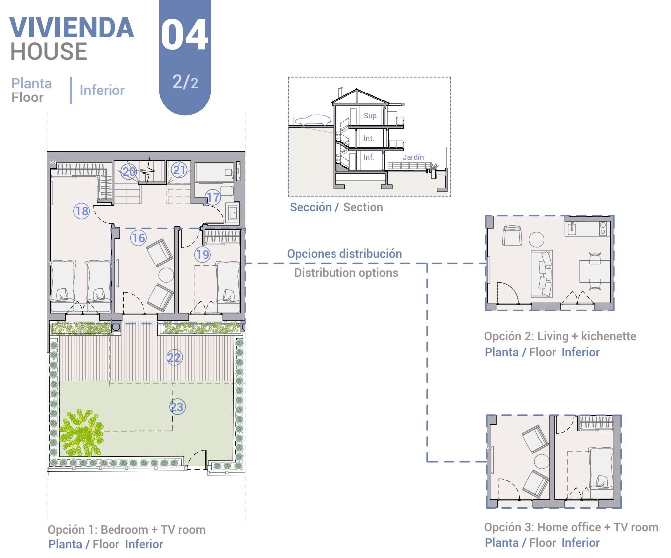Onderste verdieping: derde slaapkamer en badkamer, optie voor vierde slaapkamer, living met kitchenette of tv-kamer met studieruimte. Extra opbergruimte van 16m².