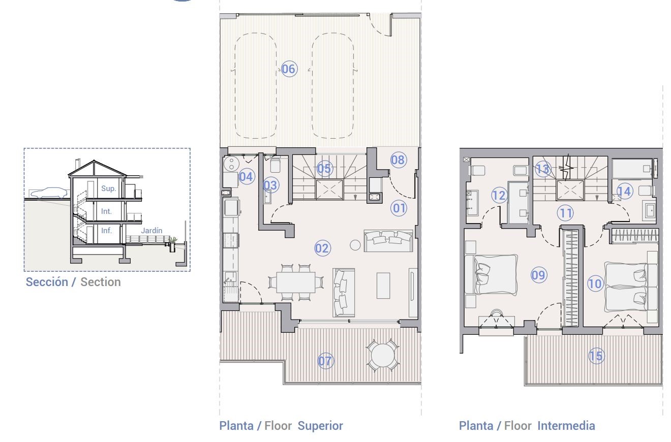Bovenste verdieping: toegang via straatniveau, ruime woonkamer met open keuken, berging met wasmachineaansluiting, gastentoilet en balkon van 14m². Buitenruimte van 86m² met parkeerplaats voor 2 wagens en buitenkeuken.