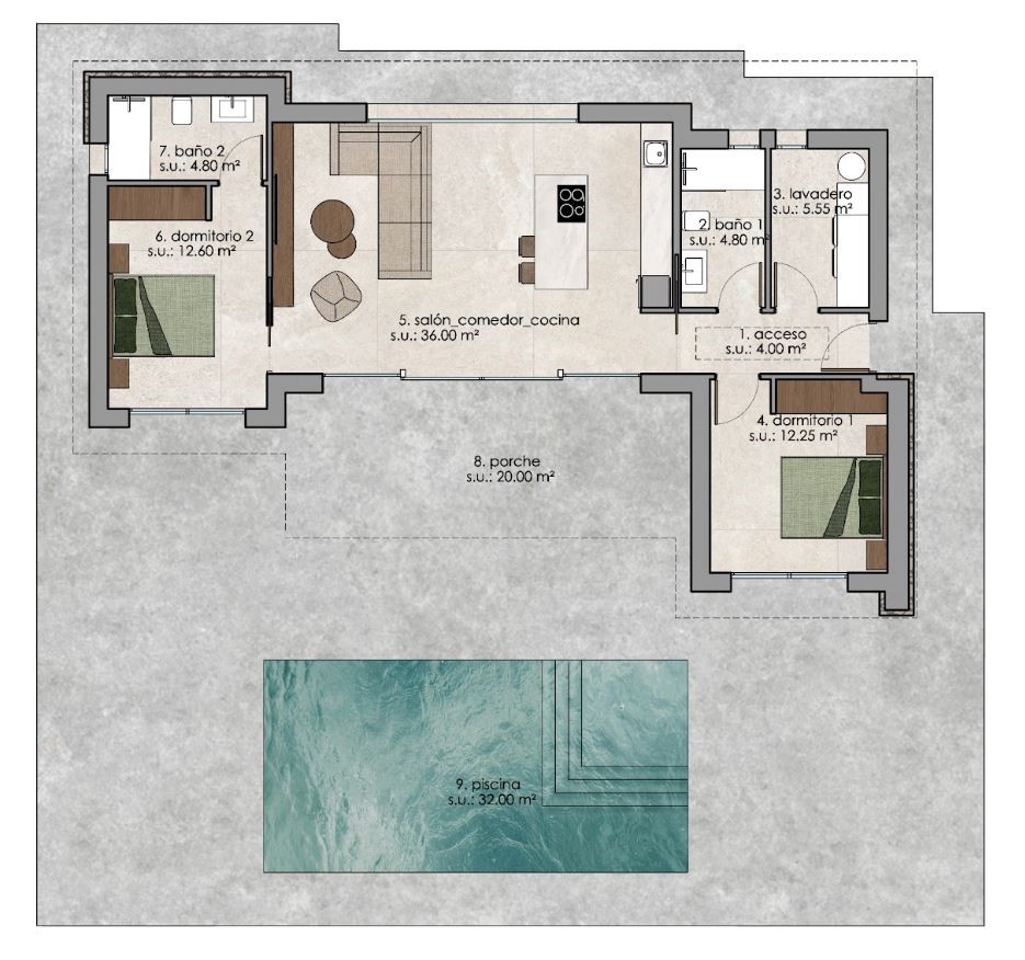 - Hoog comfortniveau met airconditioning, airzone en waterzuiveringssysteem, afgestemd op modern wonen