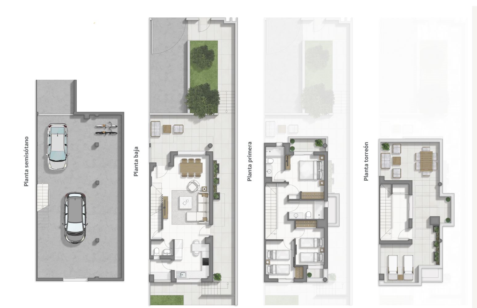 Er is een parkeerplaats voorzien op de begane vloer of een dubbele garage in de onderbouw.