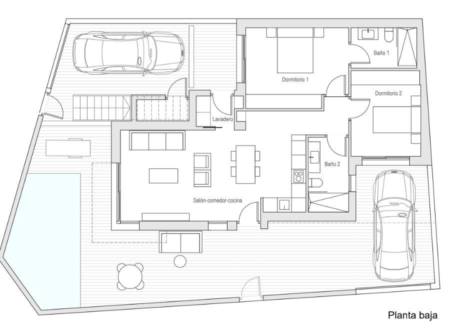 Aansluitend aan de woning heb je een wasruimte met aansluitingen voor wasmachine en droger. Deze wasruimte heeft ook rechtstreekse verbinding naar buiten. De woonkamer kijkt via een groot schuifraam uit op het zwembad.