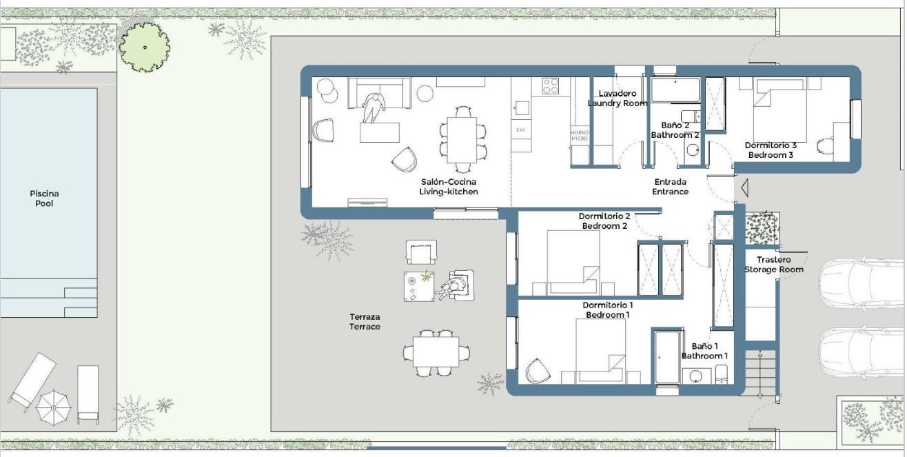 Ontdek deze moderne villa met 3 slaapkamers en 2 badkamers, gelegen op het rustige Corvera Hills Golf. De woning is praktisch ingedeeld met alle slaapkamers op het gelijkvloers, waaronder een hoofdslaapkamer met badkamer-ensuite. De lichtrijke leefruimte met open U-vormige keuken vormt het hart van de woning en sluit via grote schuiframen naadloos aan op de tuin.