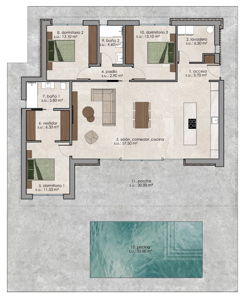 Ontdek model Pompeya, een gelijkvloerse villa met 3 slaapkamers en 2 badkamers, ontworpen met oog voor comfort en praktisch wonen. Via de inkomhal kom je terecht in de lichtrijke leefruimte met open keuken en kookeiland, volledig uitgerust met kwalitatieve toestellen. Dankzij de kamerhoge schuiframen vloeit de binnenruimte naadloos over in het terras en de tuin, met zicht op het privézwembad.