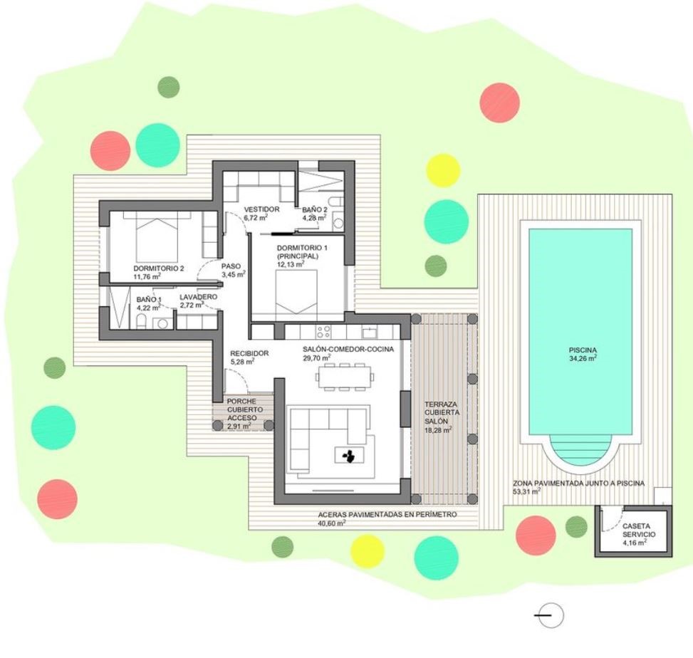 De woning wordt volledig op maat gebouwd, met keuze in materialen en afwerking. Het aangelegde deel van 2.500 m² omvat een terras, tuin en zwembad van 34m² — een oase van rust in het Spaanse binnenland.